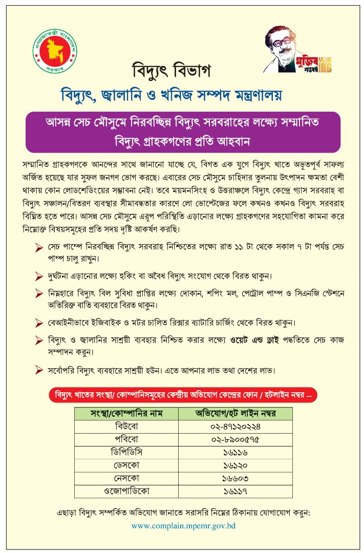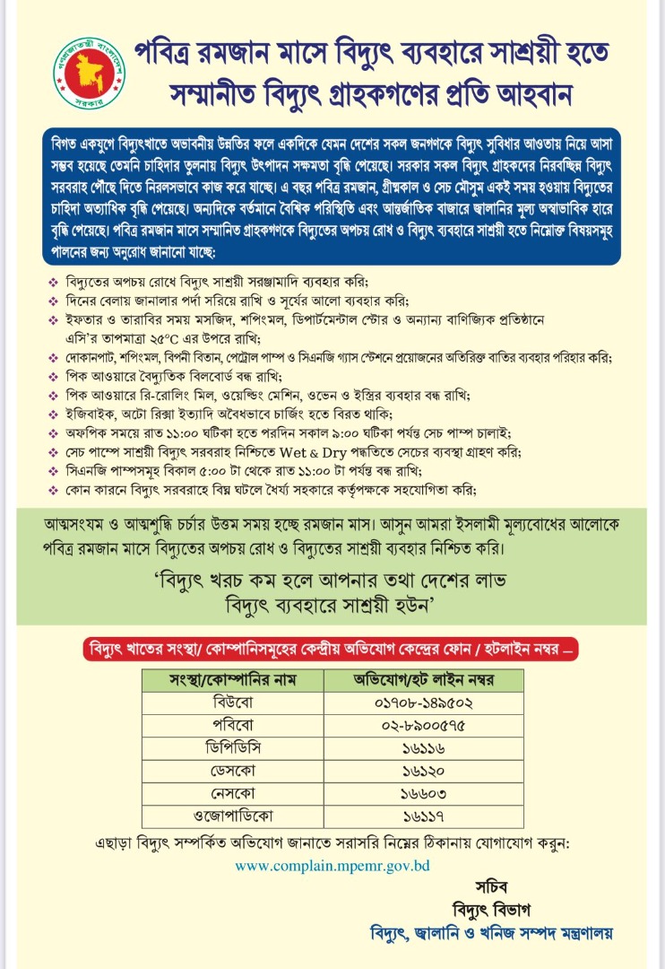 | ২৭ | পবিত্র রমজান মাসে বিদ্যুৎ ব্যবহারে সাশ্রয়ী হতে সম্মানীত বিদ্যুৎ গ্রাহকগণের প্রতি আহবান |  |