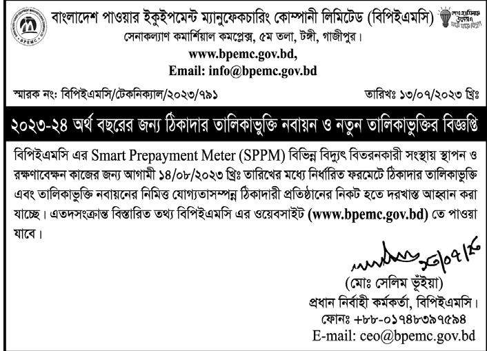| ৮২ | বিপিইএমসি স্মার্ট প্রি-পেমেন্ট মিটার স্থাপন ও রক্ষণাবেক্ষন কাজের জন্য ঠিকাদার তালিকাভুক্তি ও তালিকাভুক্তি ঠিকাদার নবায়ন বিজ্ঞপ্তি | ২২/০৭/২০২৩ |  |