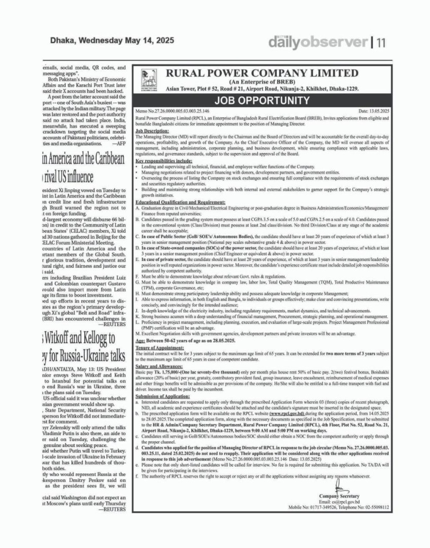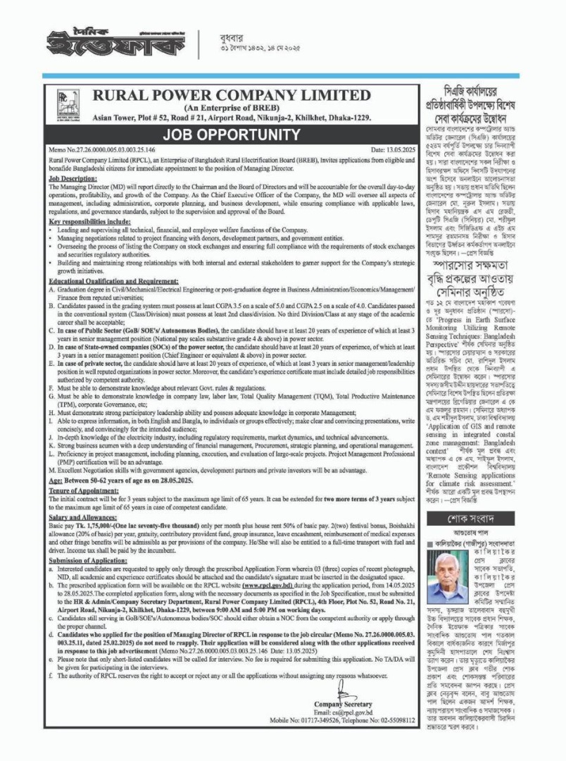 | আরপিসিএল-এ ‘ব্যবস্থাপনা পরিচালক’ পদে কর্মকর্তা নিয়োগ বিজ্ঞপ্তি | ১৪/০৫/২০২৫ |    |
